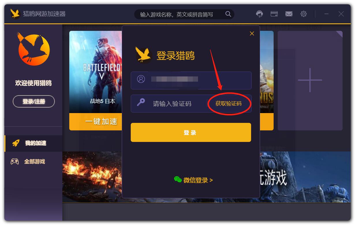打开猎鸥客户端后,点击左侧【登录账号】——在弹出的对话框中输入正确的【手机号】——获取手机短信验证码,进行正确输入。